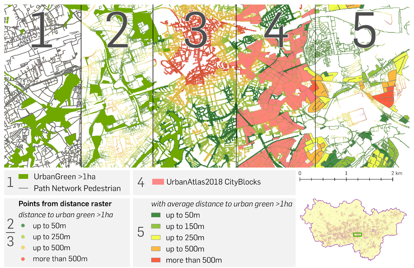 Ein weiteres Beispiel aus der aktuellen Forschung der Ruhr-Universität-Bochum zeigt, wie Satellitendaten zu einem gleichberechtigten Zugang zu städtischen Grünflächen beitragen können. „Ich habe im Rahmen meiner wissenschaftlichen Forschung eine umfassende Netzwerkanalyse durchgeführt, bei der allen (auch teilweise) bewohnten Baublöcken im Ruhrgebiet eine Klasse zugewiesen wurde, die die Distanz zu urbanen Grünflächen einer bestimmten Größe repräsentiert“, erklärt Moos.